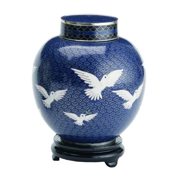 Cloisonné cremation urns are made from metal that have a decorative enamel finish. Cloisonné is an ancient, Near East metalworking technique used in the decorating of metal objects. The first recorded use of the cloisonné technique was in Ancient Egypt, but was also popular during the Roman and Byzantine Empires. The Chinese, however, made the cloisonné technique famous in the modern world, since the most elaborate and highly-valued cloisonné pieces are from the early Ming Dynasty.