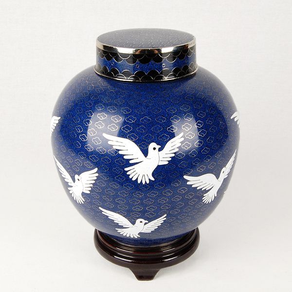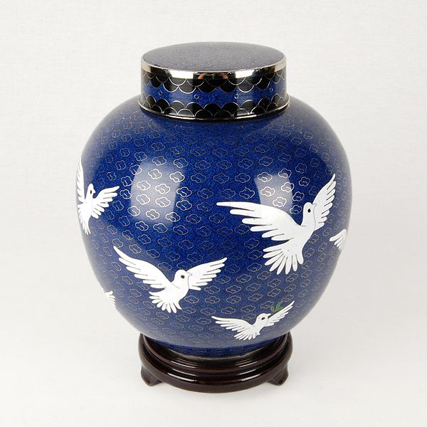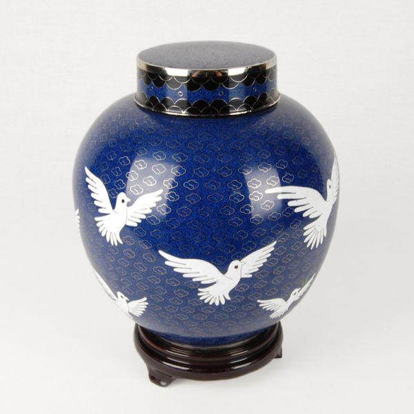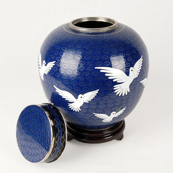 The Dove cloisonné cremation urn is crafted in the shape of a traditional style vase with a hand-applied enamel and a wooden base. It has a threaded, top-opening lid.