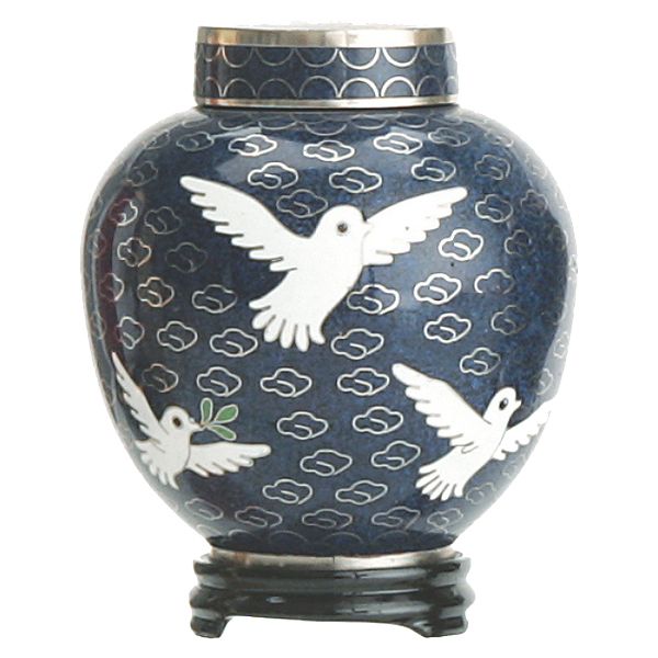 The Dove cloisonné token cremation urn is crafted in the shape of a traditional style vase with a hand-applied enamel. It has a top-opening lid and a plastic base is included.