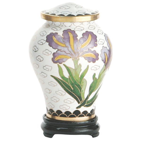 The White Iris cloisonné token cremation urn is crafted in the shape of a traditional style vase with a hand-applied enamel. It has a top-opening lid and a plastic base is included.