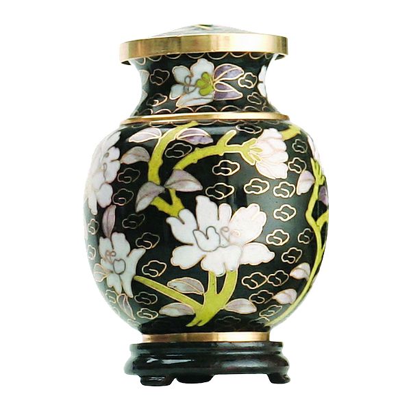 The Minuet cloisonné token cremation urn is crafted in the shape of a traditional style vase with a hand-applied enamel. It has a top-opening lid and a plastic base is included.
