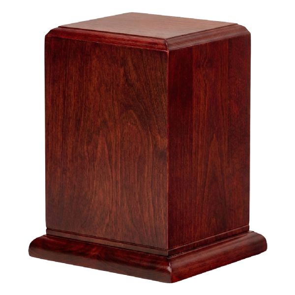 The Tribute hardwood cremation urn is crafted from solid cherry in the shape of a traditional style rectangular cube.