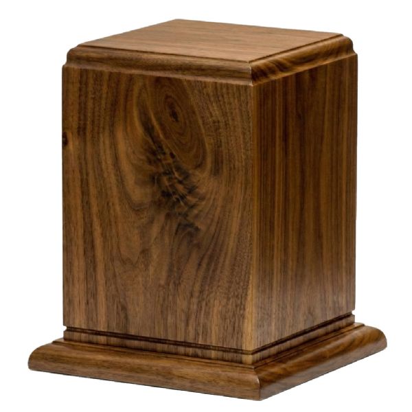 The Tribute hardwood cremation urn is crafted from solid walnut in the shape of a traditional style rectangular cube.