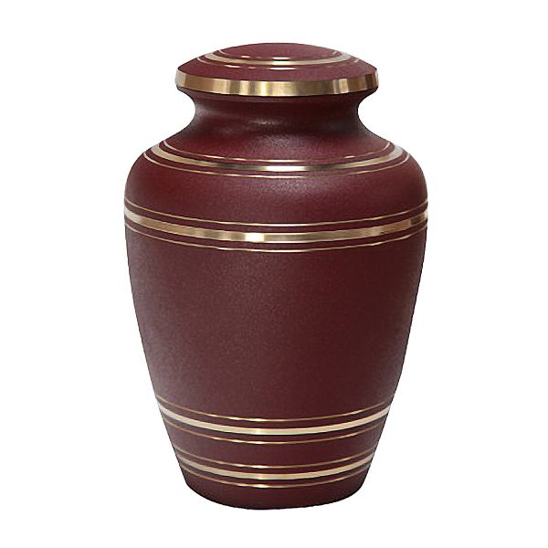 The Cabernet brass cremation urn is crafted in the shape of a classic vase with an enamel finish with gold rings. It has a a threaded, top-opening lid.