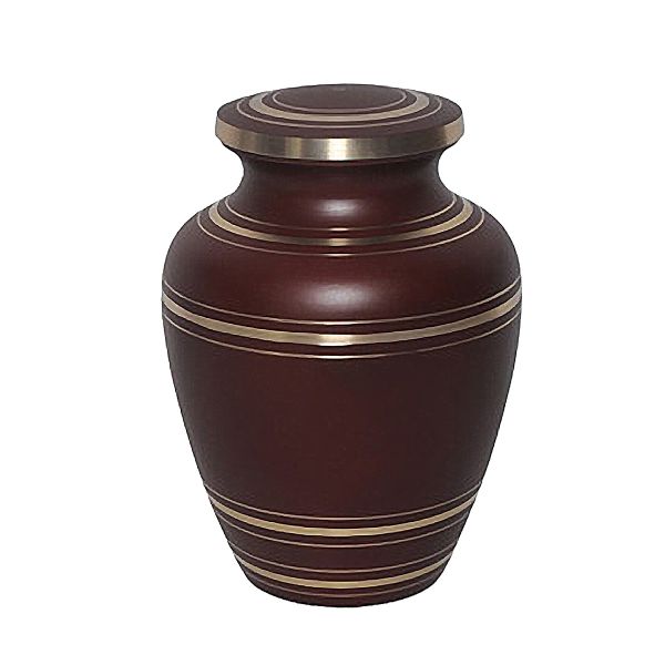 The Cabernet brass keepsake cremation urn is crafted in the shape of a classic style vase with an enamel finish with gold rings. It has a a threaded, top-opening lid.
