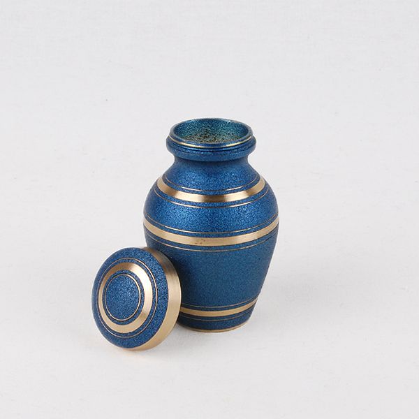 The Wedgewood brass token cremation urn is crafted in the shape of a classic style vase with an enamel finish with gold rings. It has a a threaded, top-opening lid.