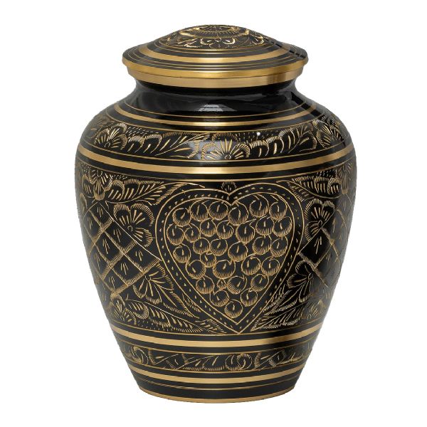 The Etched Ebony brass cremation urn is crafted in the shape of a classic vase with an engraved finish. It has a a threaded, top-opening lid.