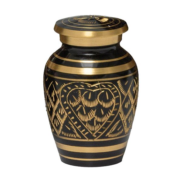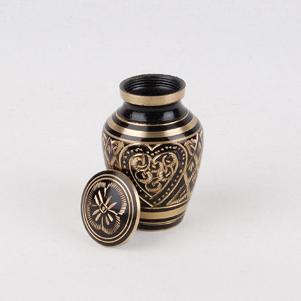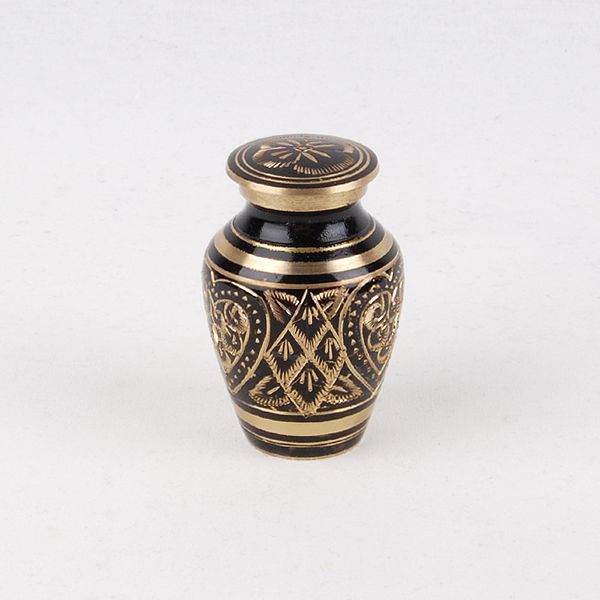 The Etched Ebony brass token cremation urn is crafted in the shape of a classic style vase with an engraved finish. It has a a threaded, top-opening lid.