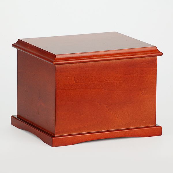 The Coronet hardwood cremation urn is crafted from solid cherry wood in the shape of a rectangular cube.
