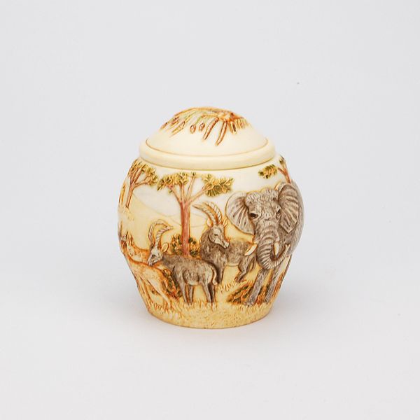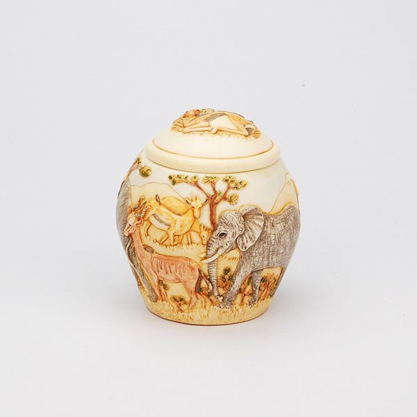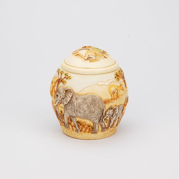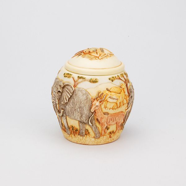 The Hakuna Matata keepsake cremation urn is crafted using a special crushed marble resin, pioneered in the English Cotswolds. This elegant and imaginative cachepot is carved with a graceful bas-relief scene of elephants and gazelles grazing the African Serengeti with Mt. Kilimanjaro in the distance. It has a warm ivory look and feel. Every piece is hand-tinted, lending each urn its distinctive character.
