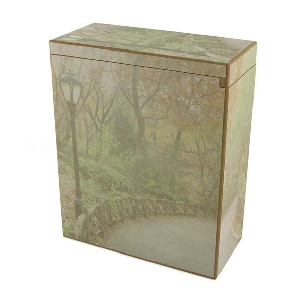 The Pathway scattering cremation urn is designed to enhance a memorial scattering ceremony. It is made from Medium Density Fiberboard (MDF) and has a sliding panel opening system on the top for scattering use. The cover can be fully removed if necessary when inserting cremated remains. The Pathway scattering urn is encased with