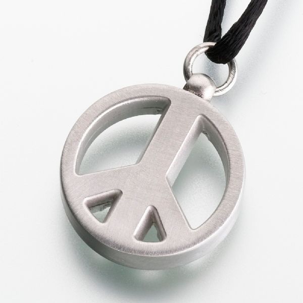 The Peace cremation jewelry pendant is a pewter charm crafted in the shape of a Peace Sign and includes a black satin cord. Cremation jewelry ash pendant necklaces are designed to hold a small portion of ashes, or cremated remains, a small lock of hair, dried flowers, or earth from a special location. The Peace keepsake pendant makes it possible for family members or friends to keep precious and cherished memories close to the heart.