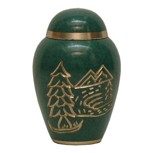 The Mountain Scene brass token cremation urn is crafted in the shape of a classic style vase with an etched and enamel finish. It has a threaded, top-opening lid.