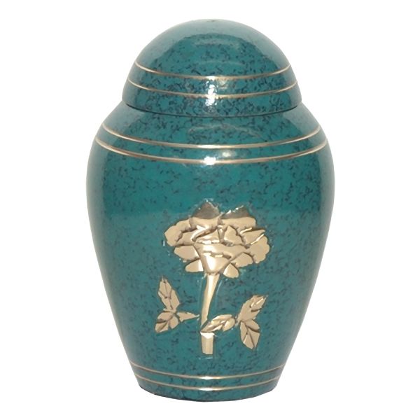 The Rose Teal brass token cremation urn is crafted in the shape of a classic style vase with an etched and enamel finish. It has a threaded, top-opening lid.