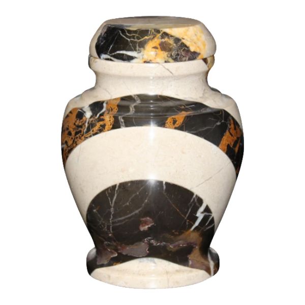 The Carpel Cameo King Gold genuine stone keepsake cremation urn is crafted in the shape of a classic style vase. It has a top-opening lid that can be sealed closed using the included epoxy sealant.