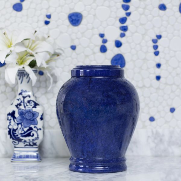 The Embrace Blue genuine stone cremation urn is crafted from natural-quarried marble in the shape of a classic style vase. The Embrace Rainbow Series is created using the most unique techniques of staining marble to reach unsurpassed vibrant colors. It has a top-opening lid that can be sealed closed using the included epoxy sealant.
