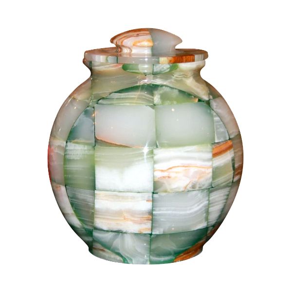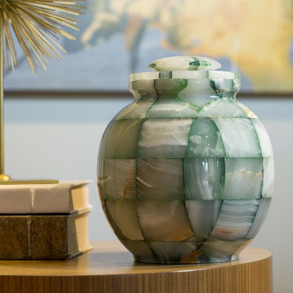 The Triumph Onyx Green genuine stone cremation urn is crafted from natural-quarried marble in the shape of a contemporary style vase. It has a top-opening lid that can be sealed closed using the included epoxy sealant.