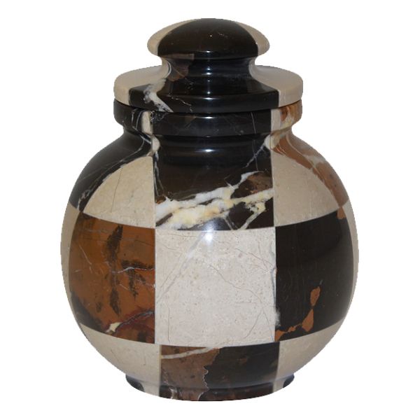 The Triumph Cameo King Gold genuine stone keepsake cremation urn is crafted in the shape of a contemporary style vase. It has a top-opening lid that can be sealed closed using the included epoxy sealant.