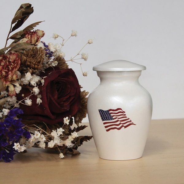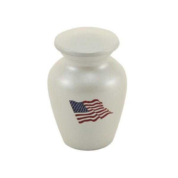The Classic Color Flag brass token cremation urn is crafted in the shape of a classic style vase with an American flag design. It has a threaded, top-opening lid.