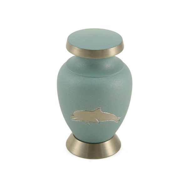 The Aria Dolphin brass token cremation urn is crafted in the shape of a classic style vase with a threaded, top-opening lid.