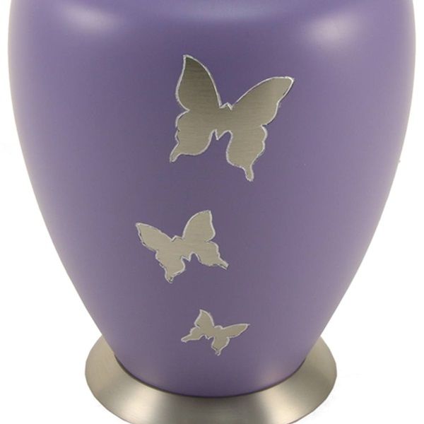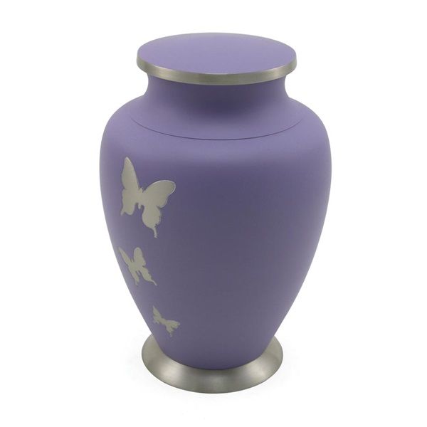 The Aria Butterfly brass cremation urn is crafted in the shape of a classic vase with a threaded, top-opening lid.