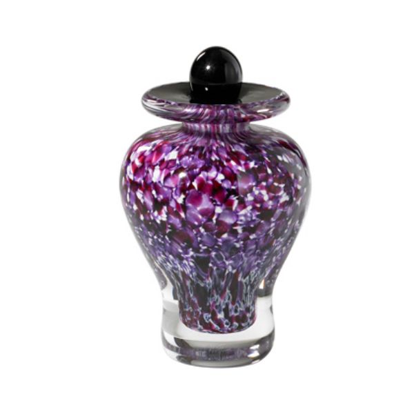 The Karine Bouchard Summer glass keepsake urn is a purple/pink hand-blown glass urn in the shape of a contemporary style vase. It captures light and conveys peace, freshness, and the renewal of life. Due to variations in the glass-blowing process, every piece is slightly different and colors may vary.