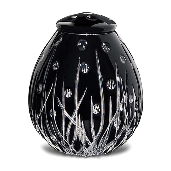 Hand-blown urn features clear glass encased in a thin layer of molten-colored glass. A master cutter creates the design in the glass and perfects its visual contract. A reflective high-gloss polish completes the urn.