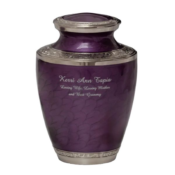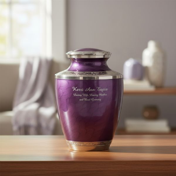 The Mother of Pearl Purple brass cremation urn is crafted in the shape of a classic vase with a mother of pearl enamel finish and silver-colored highlights. It has a a threaded, top-opening lid.