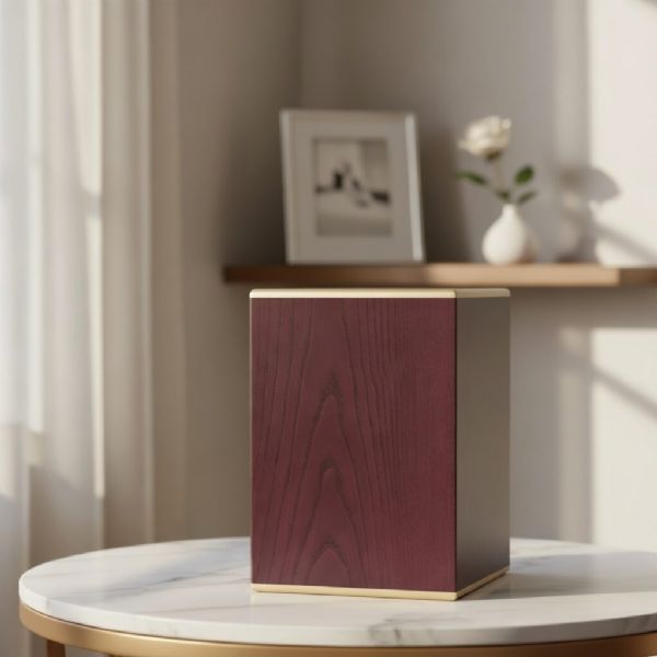 The Lavender Purple Wood cremation urn is crafted from solid hardwood in the shape of a traditional style rectangular cube.