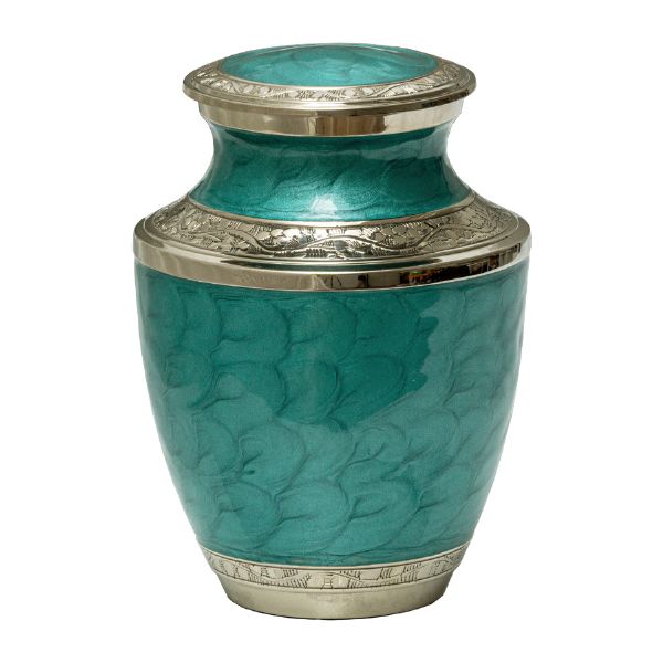 The Mother of Pearl Aqua brass cremation keepsake urn is crafted in the shape of a classic vase with a mother of pearl enamel finish and silver-colored highlights. It has a a threaded, top-opening lid.